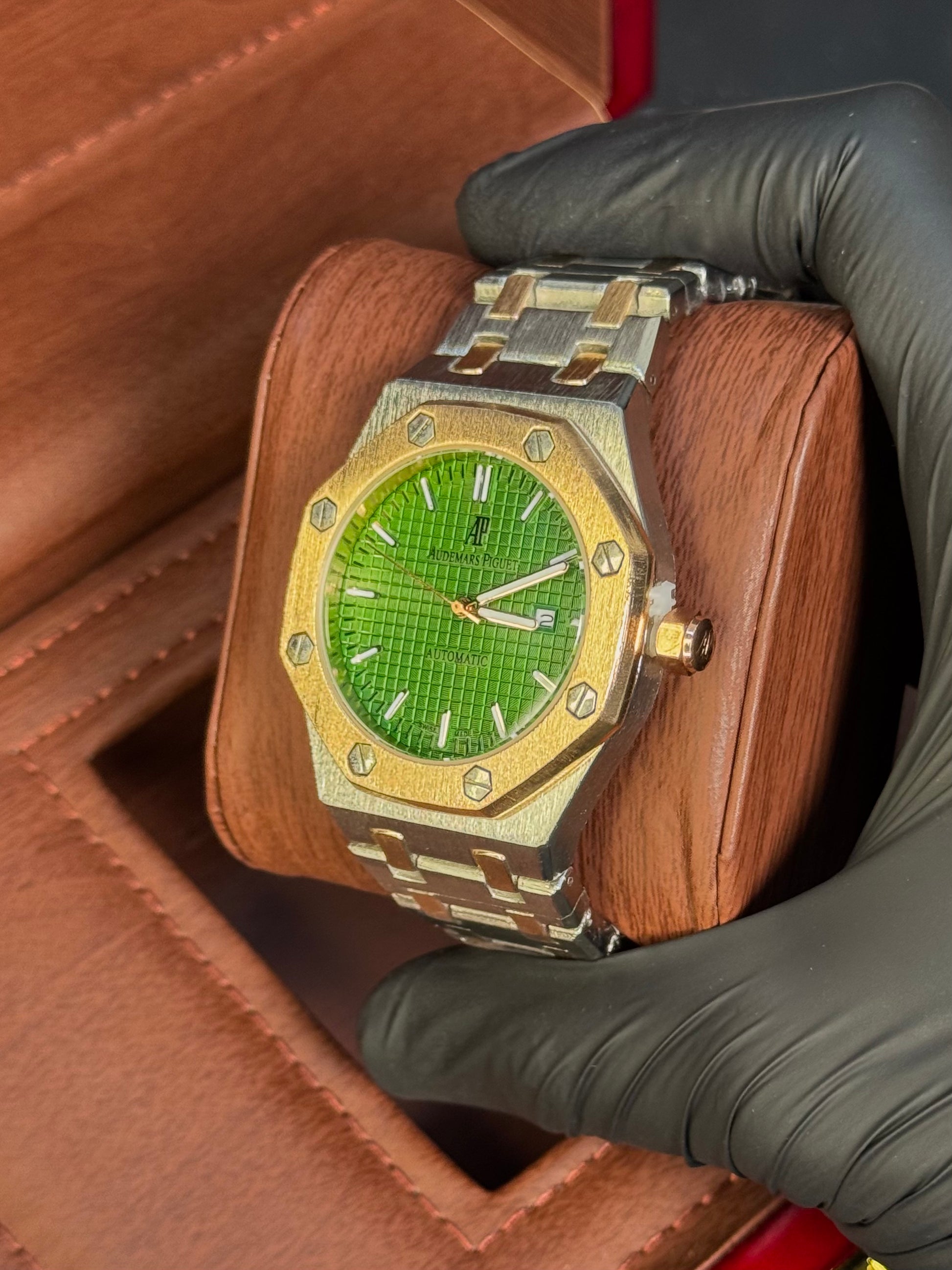 This Wristive AP Royal Oak edition features a striking green waffle-pattern dial, brushed octagonal bezel, and a two-tone silver & gold bracelet. The bold signature screw bezel and date function make it both stylish and functional — perfect for those who appreciate iconic design with a modern twist.