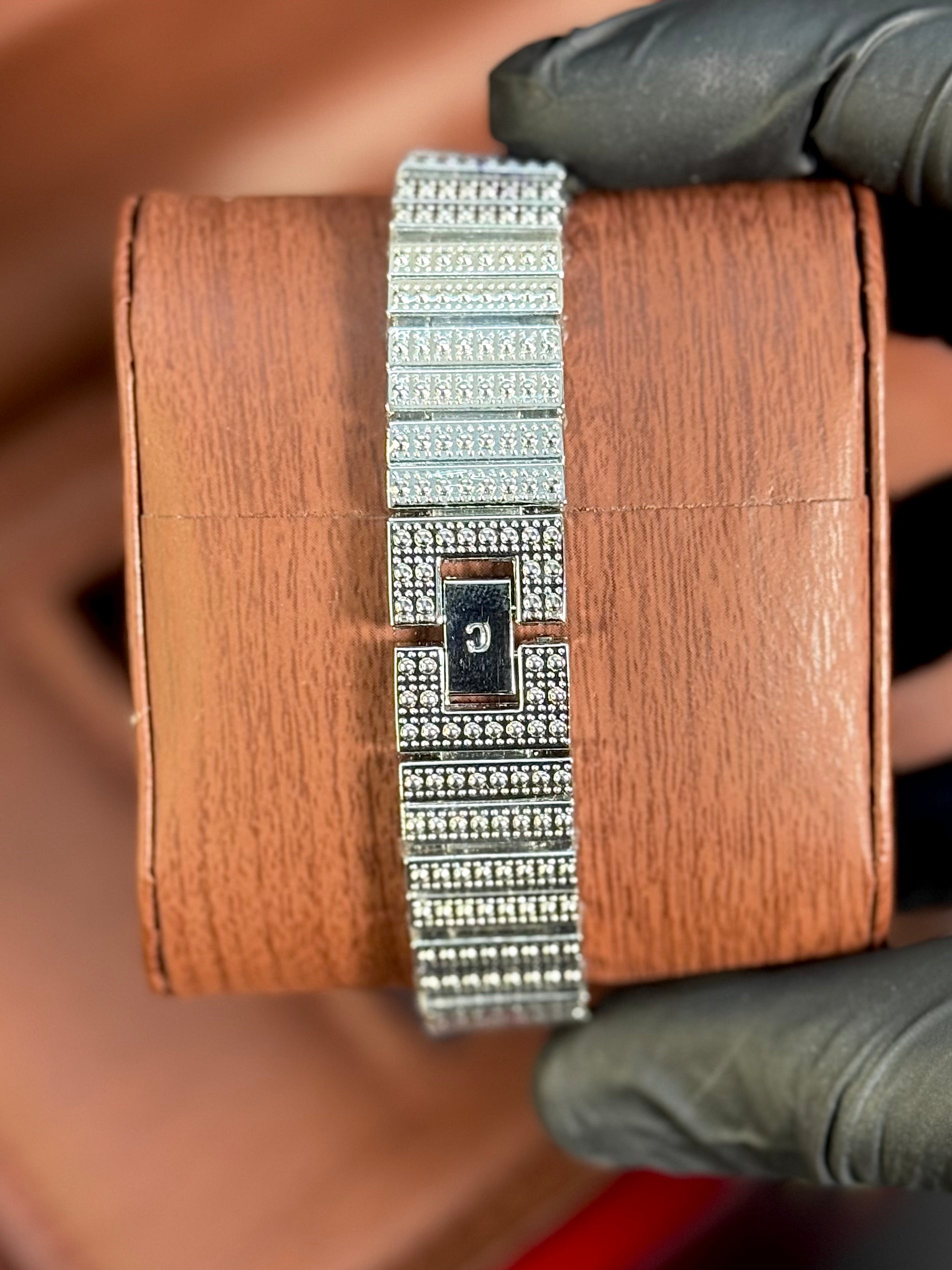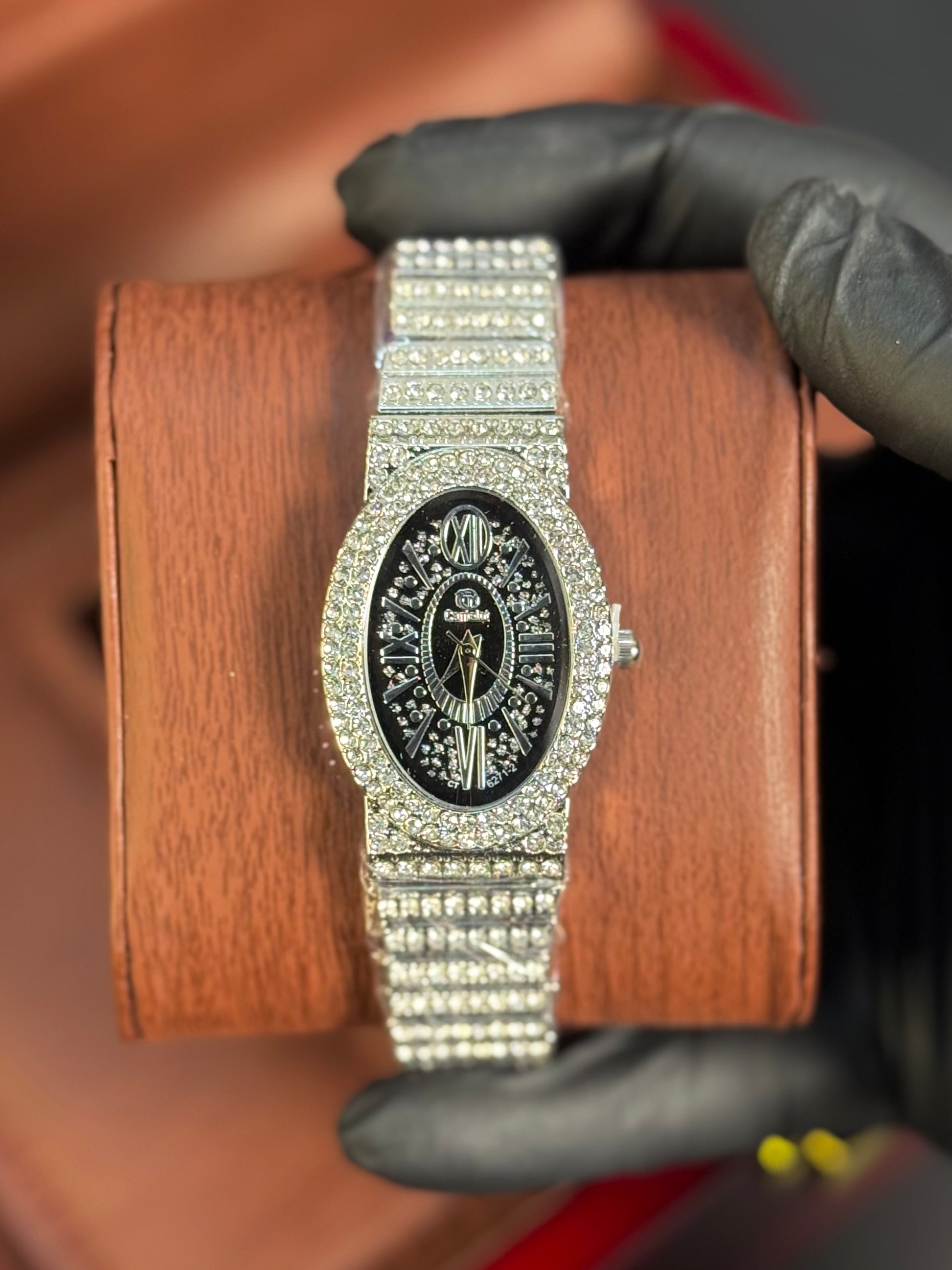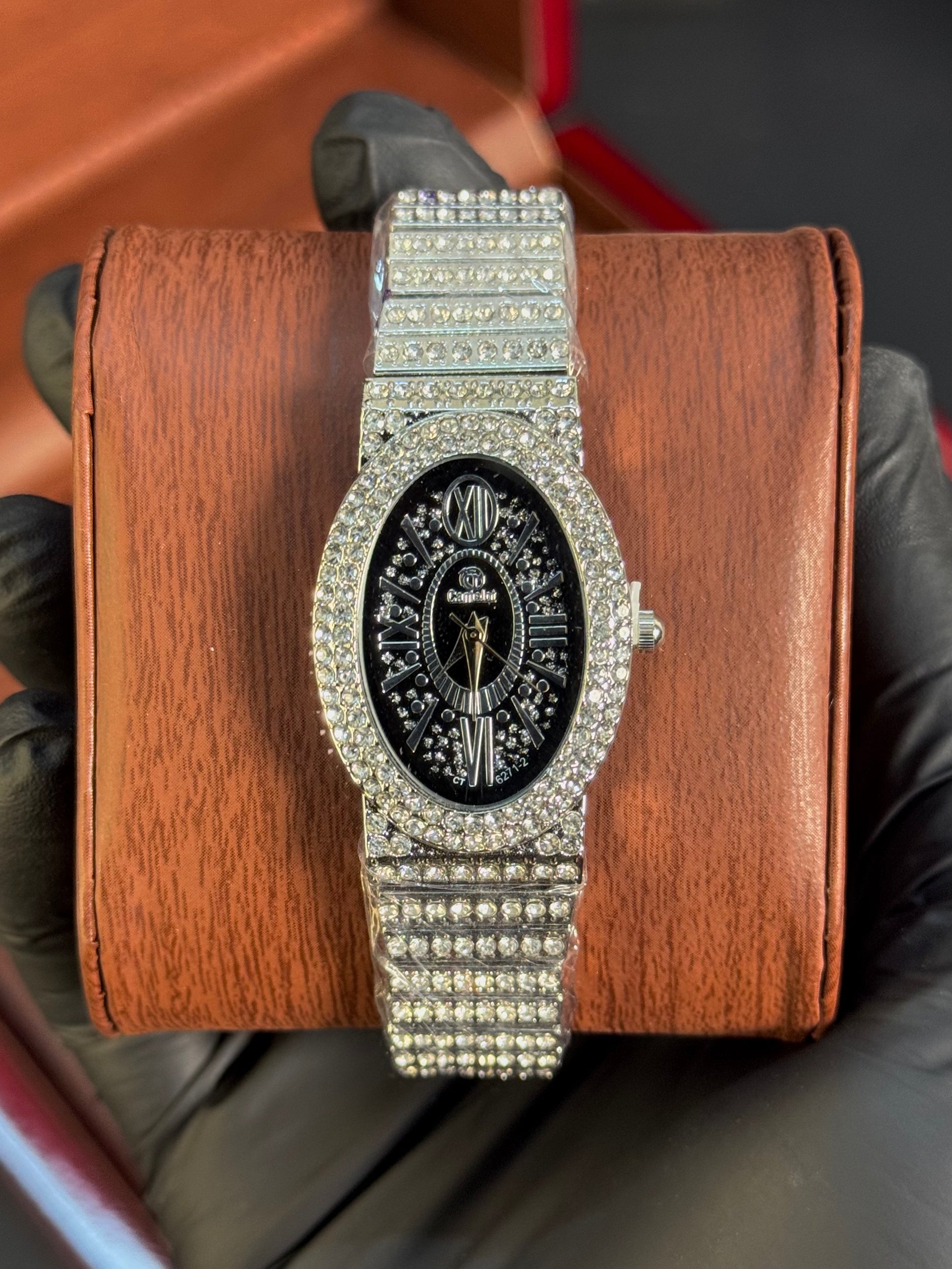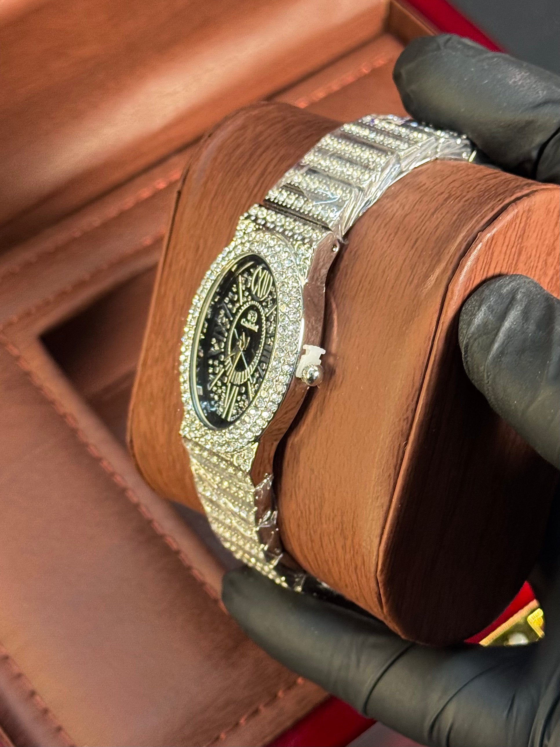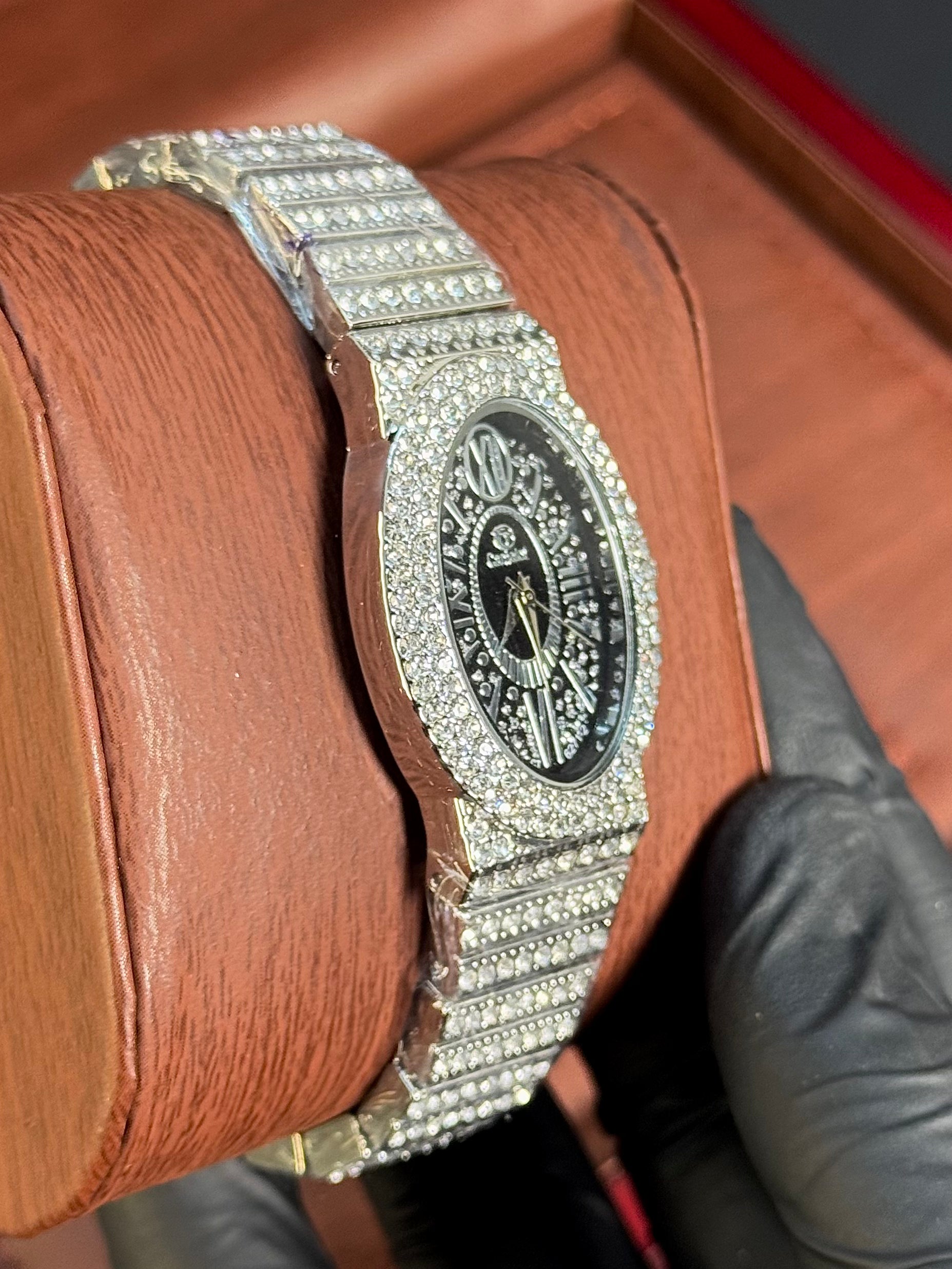 A feminine icon reimagined. Inspired by the elegant Cartier Baignoire, this timepiece features a sleek oval case, Roman numerals, and floral stone detailing on a black dial. Finished with a fully iced bracelet and shimmering bezel, it’s a perfect statement of bold beauty and timeless grace.