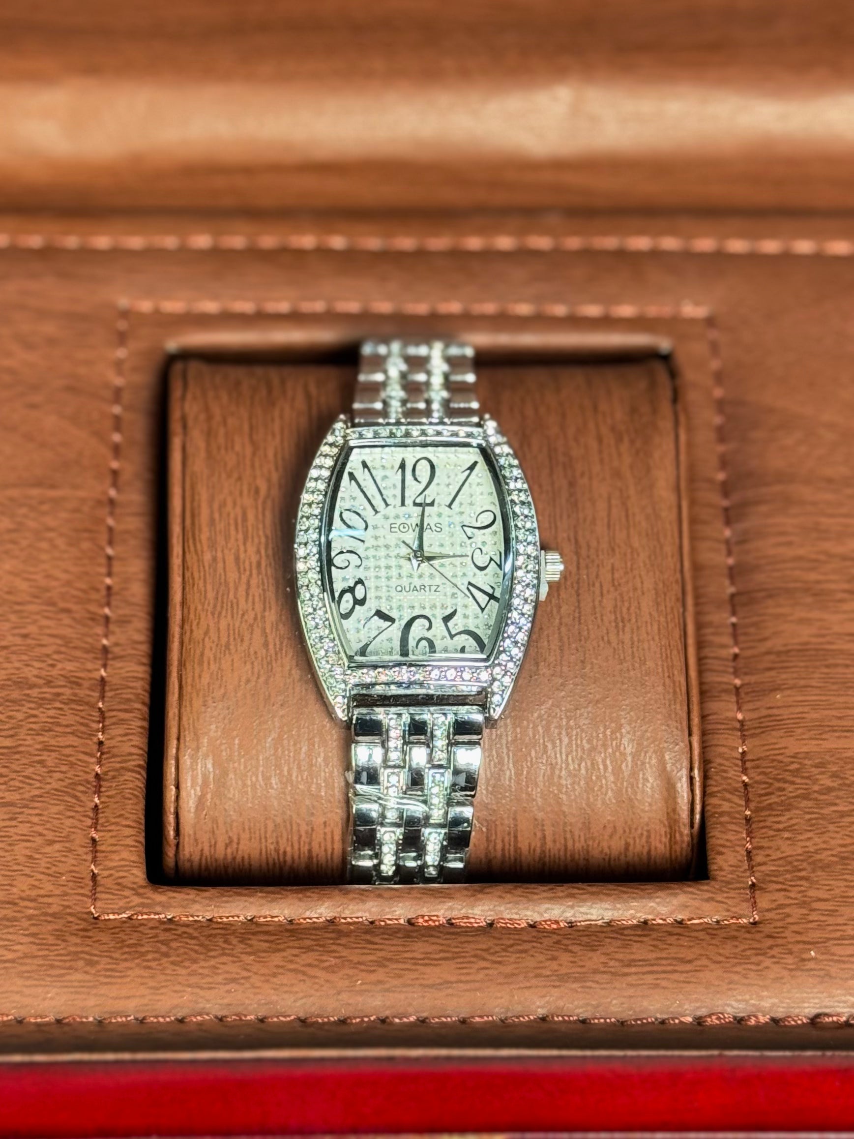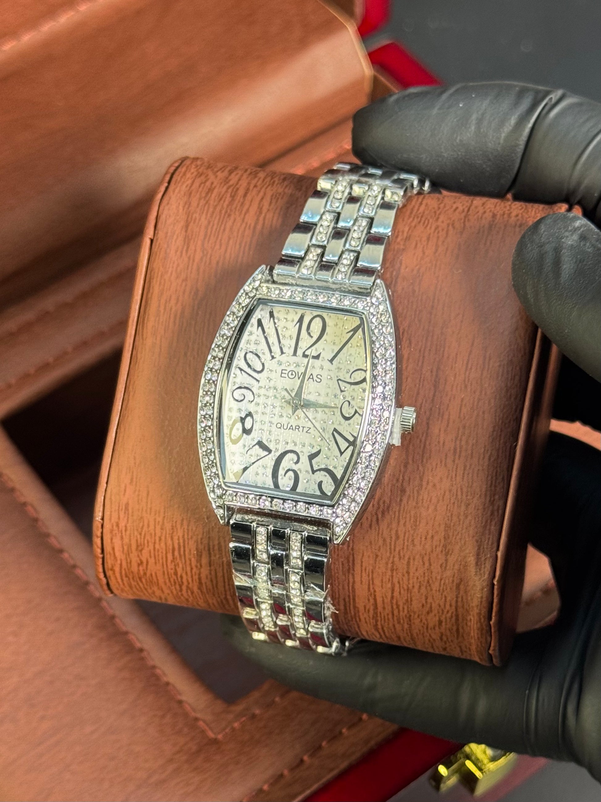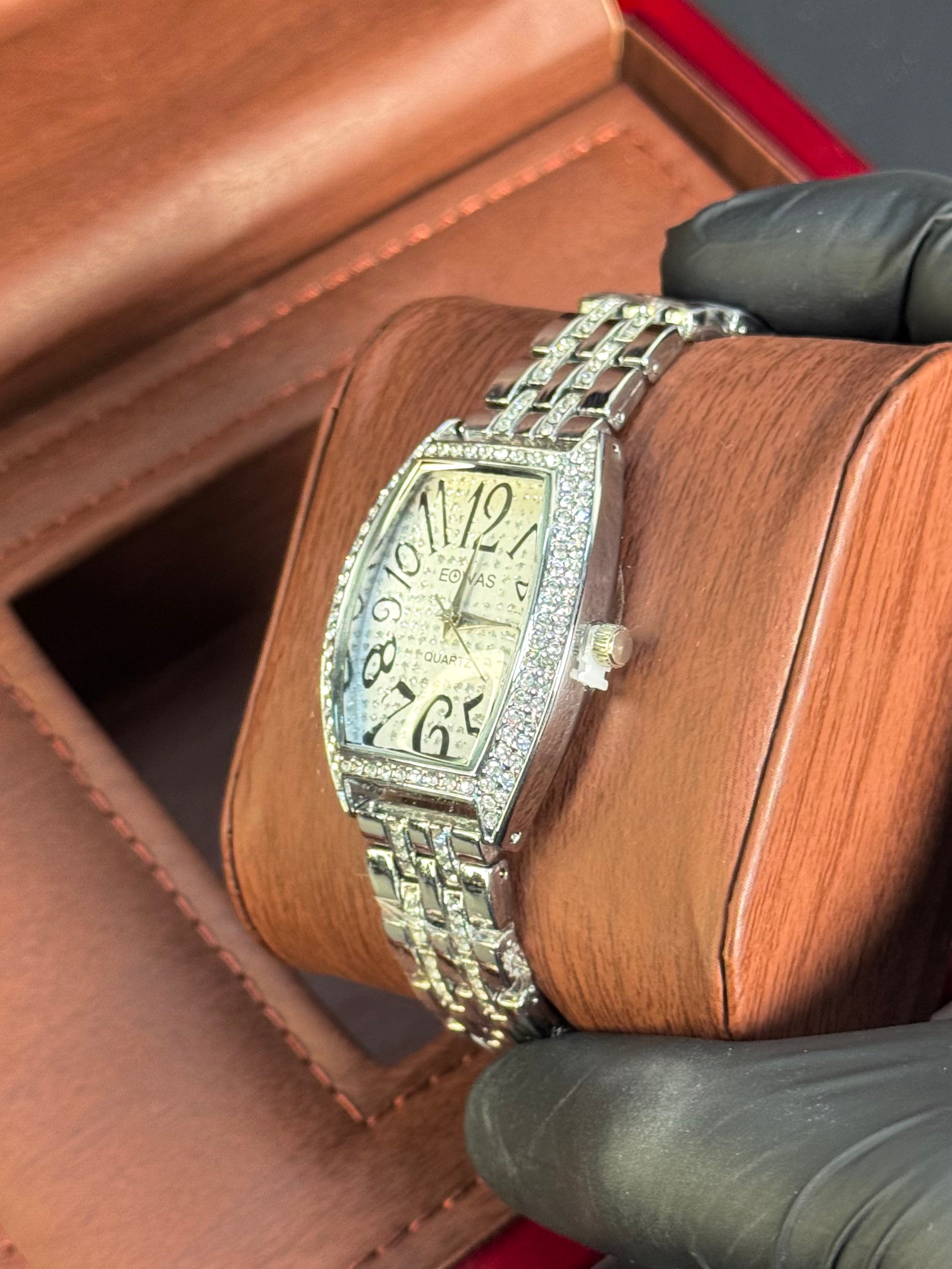 Modeled after the bold aesthetic of the Franck Muller Casablanca, this watch features a curved tonneau case, oversized stylized numerals, and a fully crystal-encrusted bezel. Finished with a polished silver bracelet, it's the ultimate fusion of vintage European design and everyday luxury.