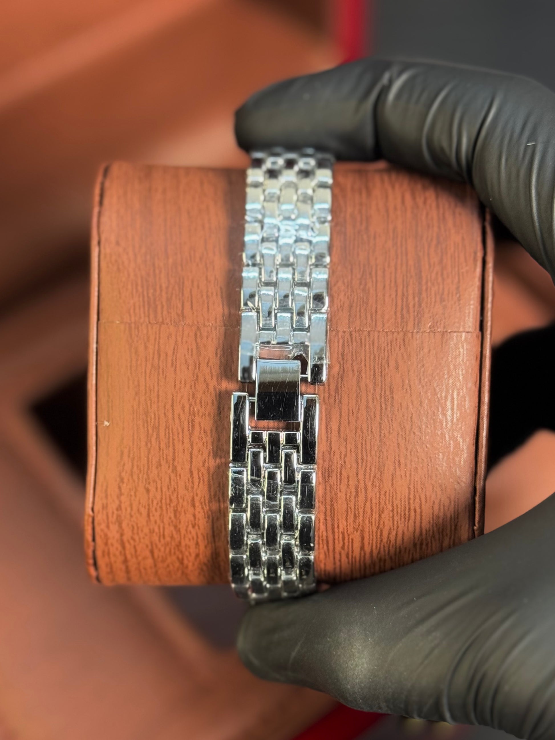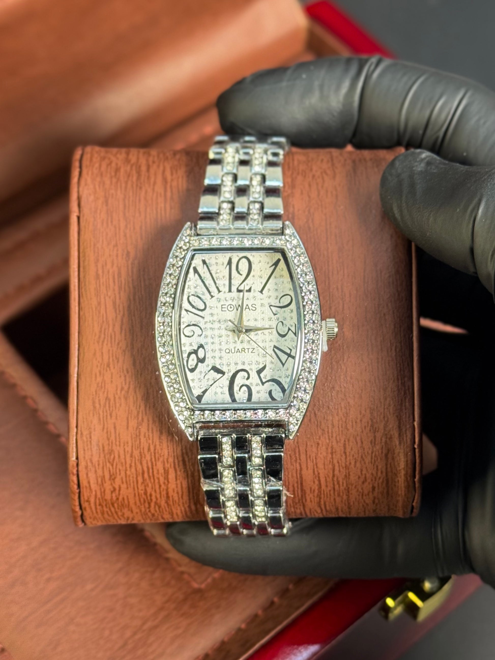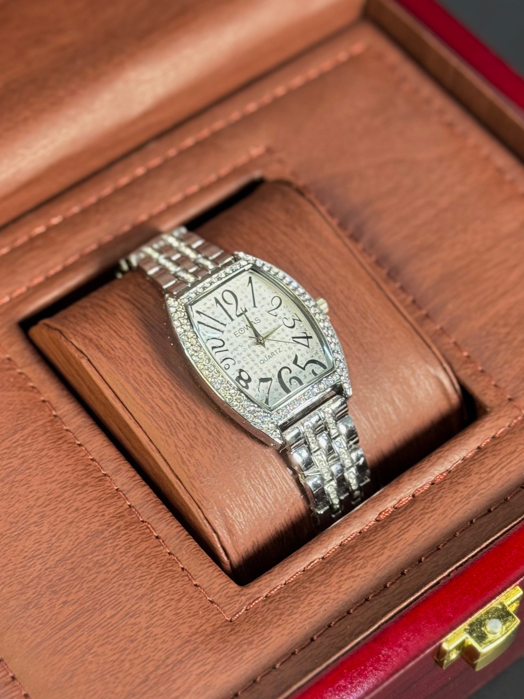 Modeled after the bold aesthetic of the Franck Muller Casablanca, this watch features a curved tonneau case, oversized stylized numerals, and a fully crystal-encrusted bezel. Finished with a polished silver bracelet, it's the ultimate fusion of vintage European design and everyday luxury.