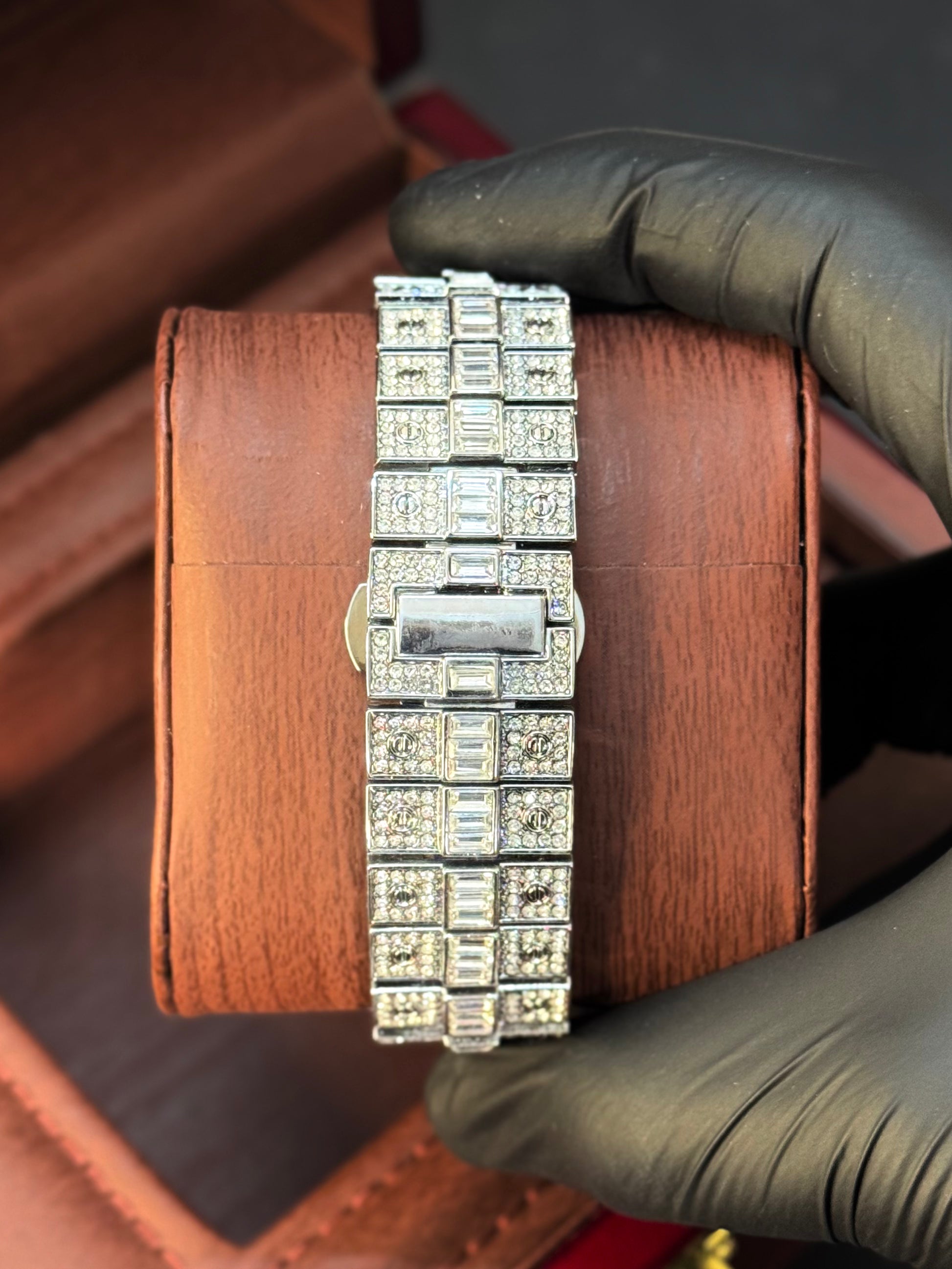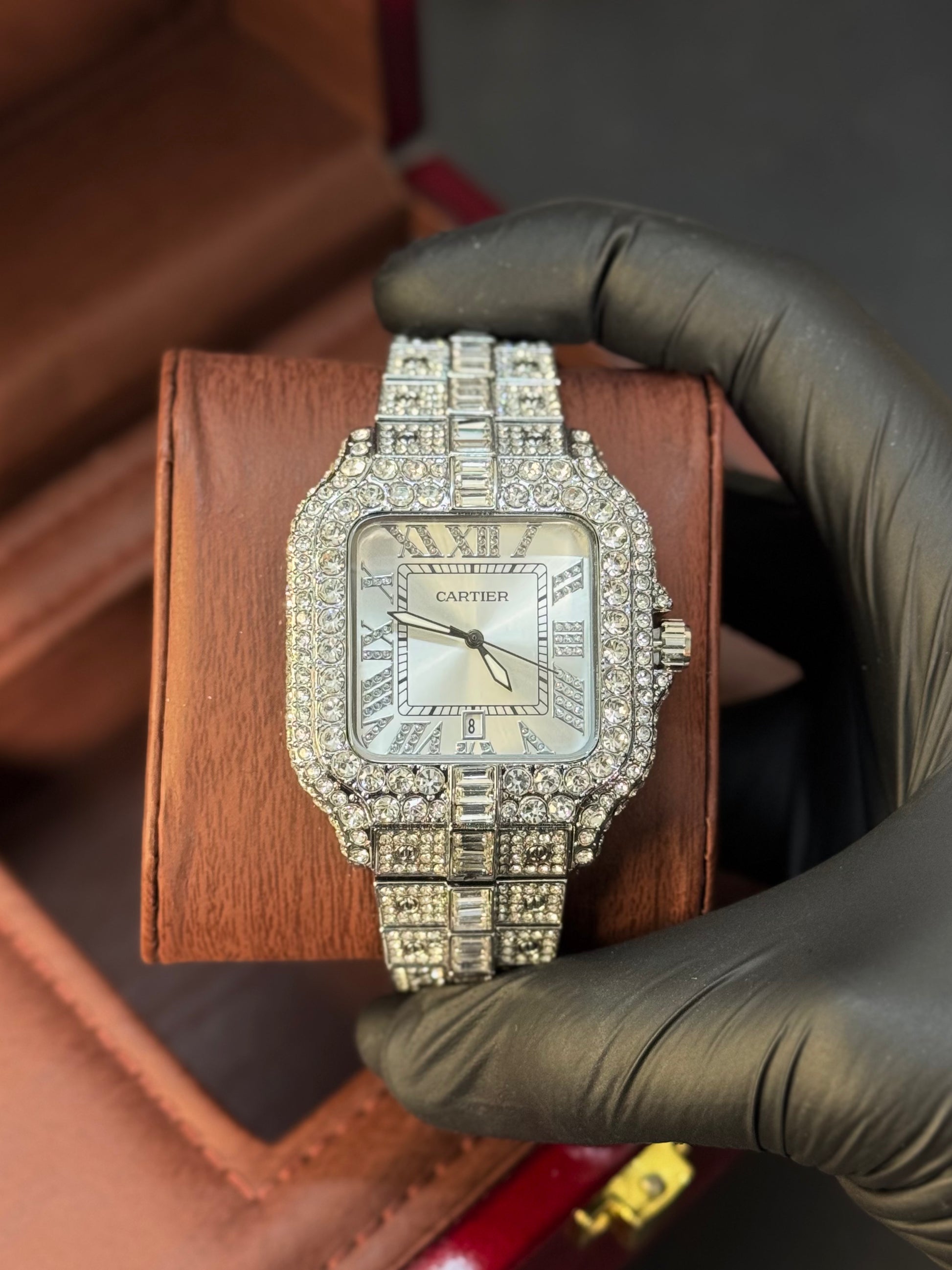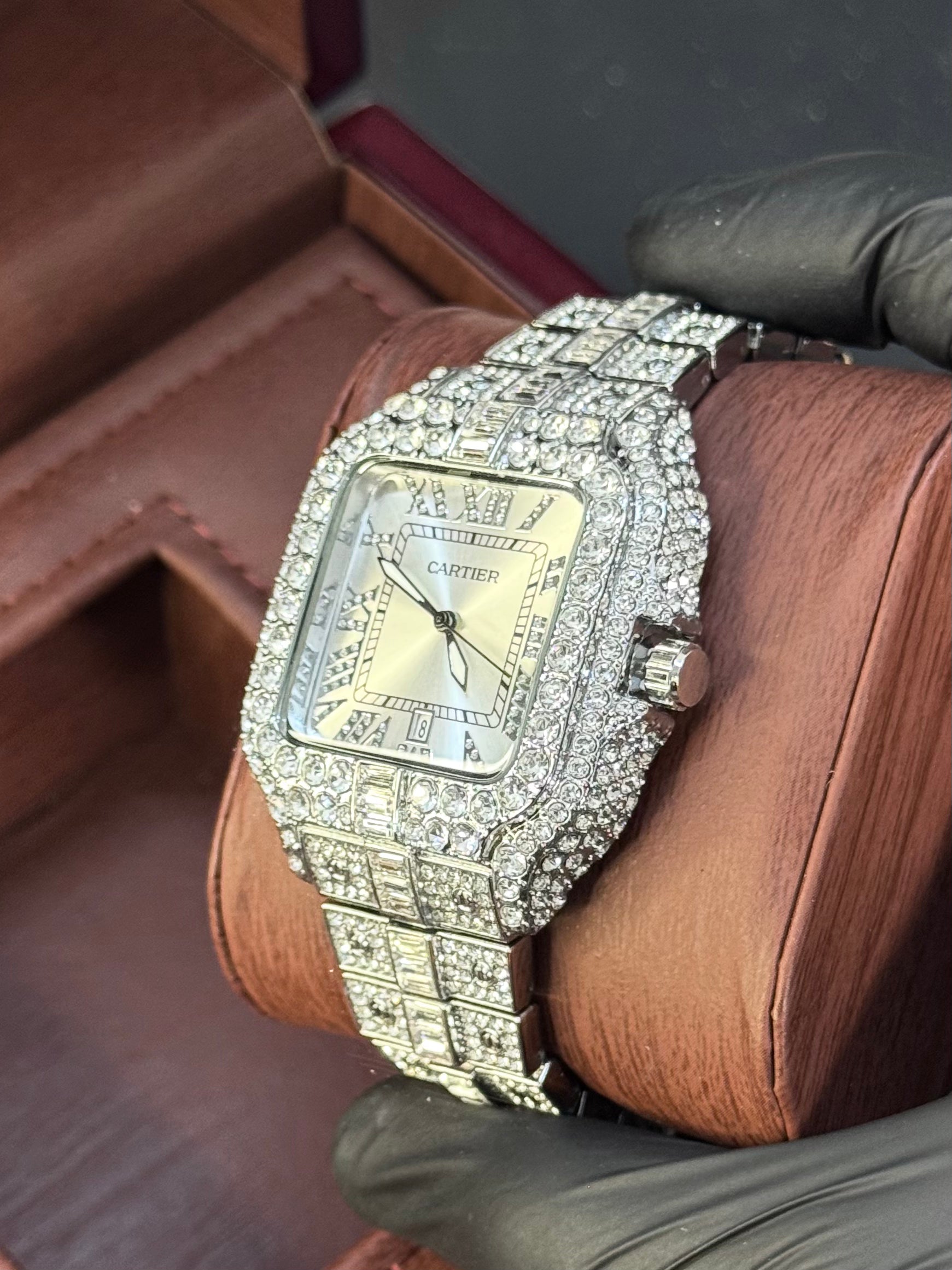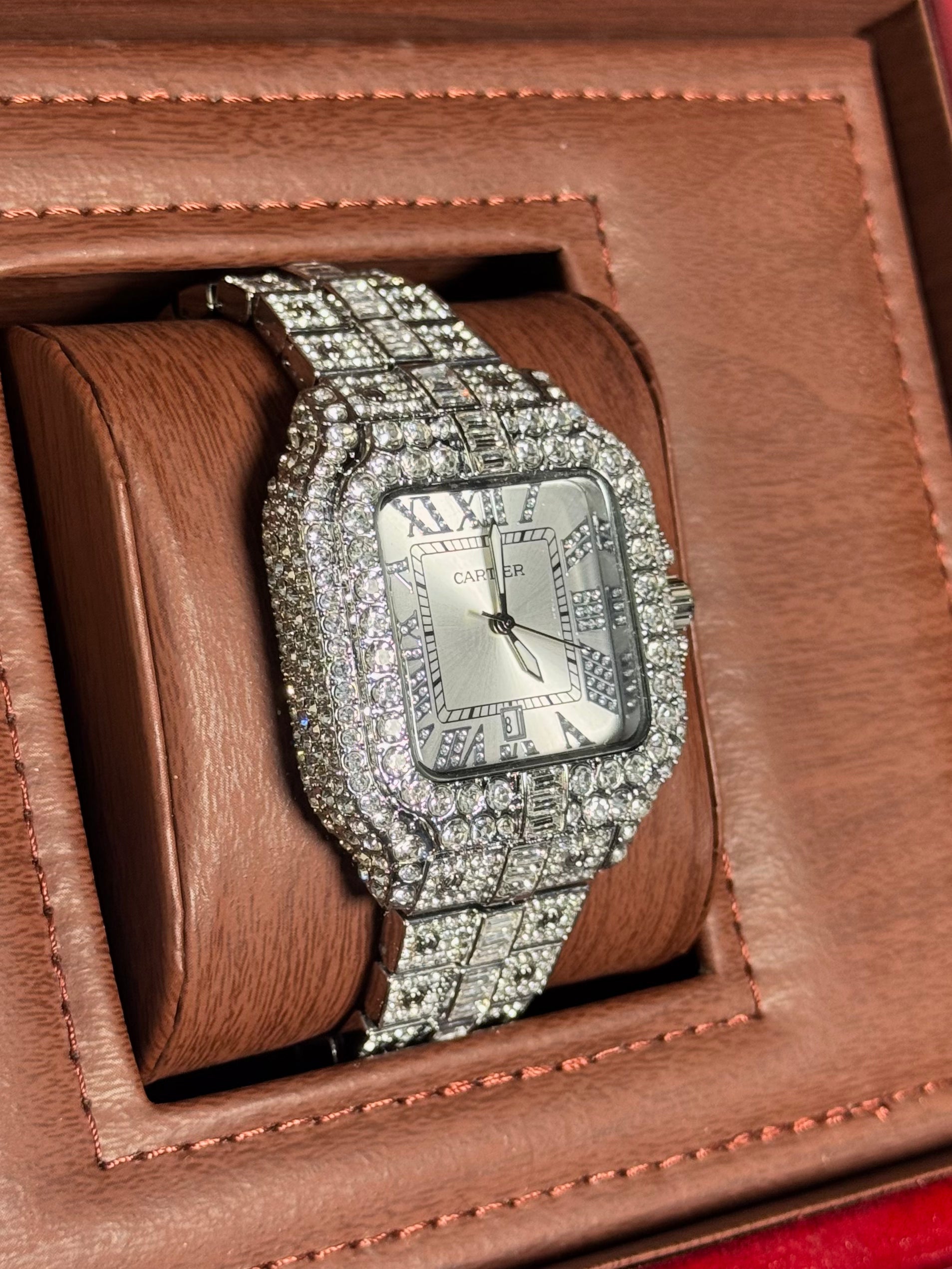 Bold, brilliant, and impossible to ignore — this CRT-inspired timepiece brings the signature Santos design to life with a full pavé crystal setting, Roman numeral dial, and a polished silver face. Featuring a date window, diamond-laced bezel, and iced link bracelet, it’s made for high-fashion moments and luxury lovers.